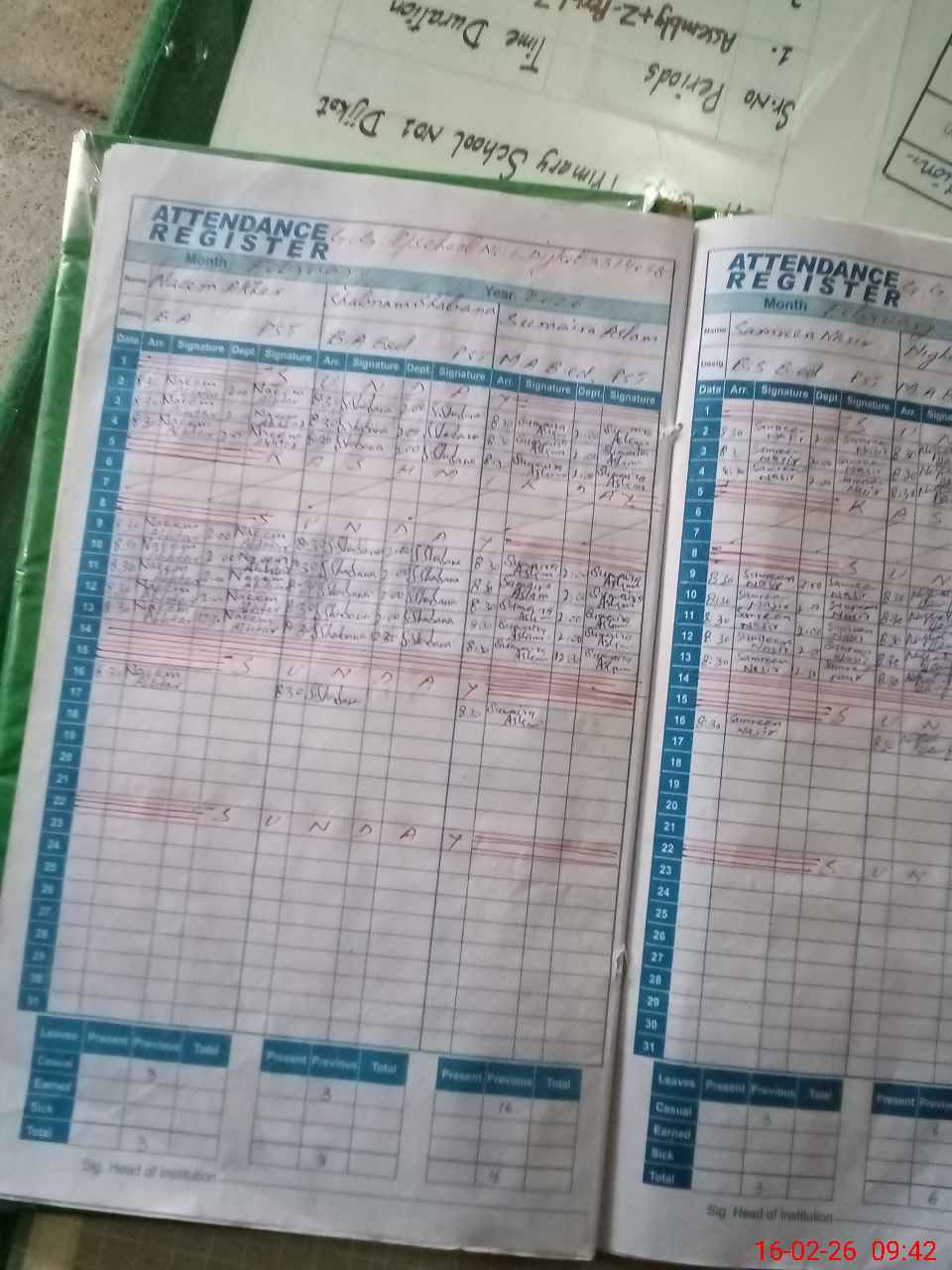 | Remarks (Use Separate Page if Required): PST sumera Aslam having baby without caregiver PST Sameena shahzadi marked present on attendance register but not present in school also not shown order book | |||||