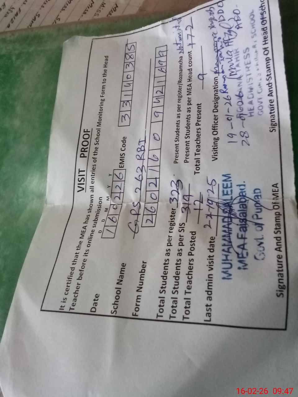 | Attendance Register | Head Teacher | MEA with School | Visit Proof |