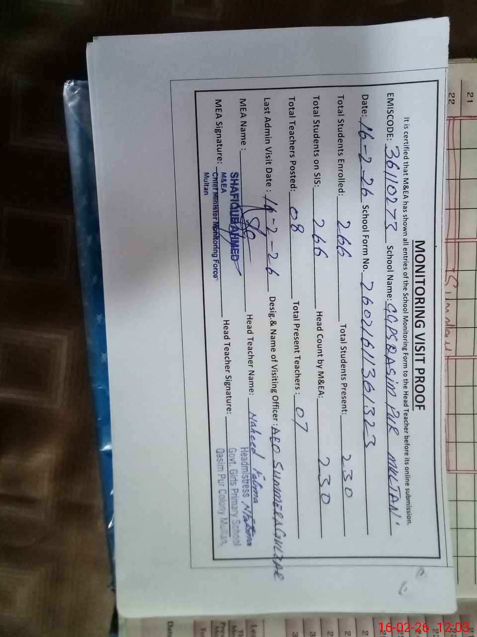 | EMIS Code: 36110273 | Name of School: GGPS QASIM PUR MULTAN | |||