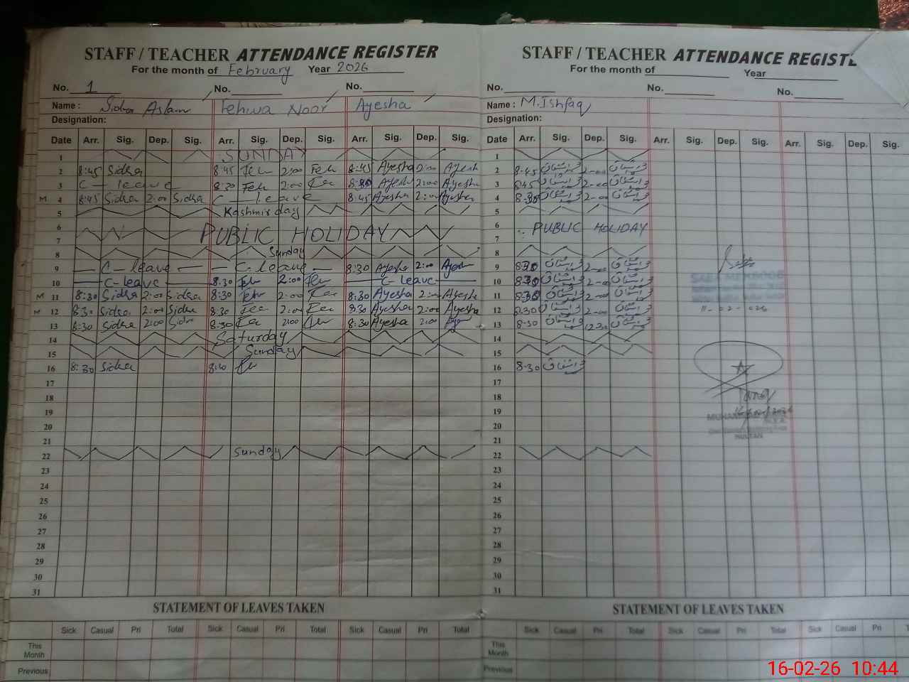 | 33**** | Ay**** Ta**** | PST Science/Maths | Regular | 0 | 0 | 0 | 0 | 0 | 0 | 0 | 0 | 0 | Absent (Un-Authorized) |