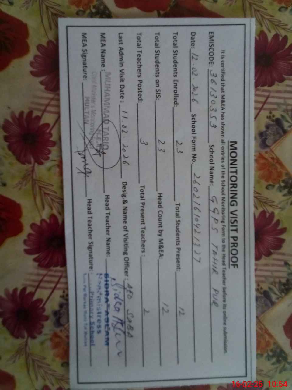 | Attendance Register | Head Teacher | MEA with School | Visit Proof |