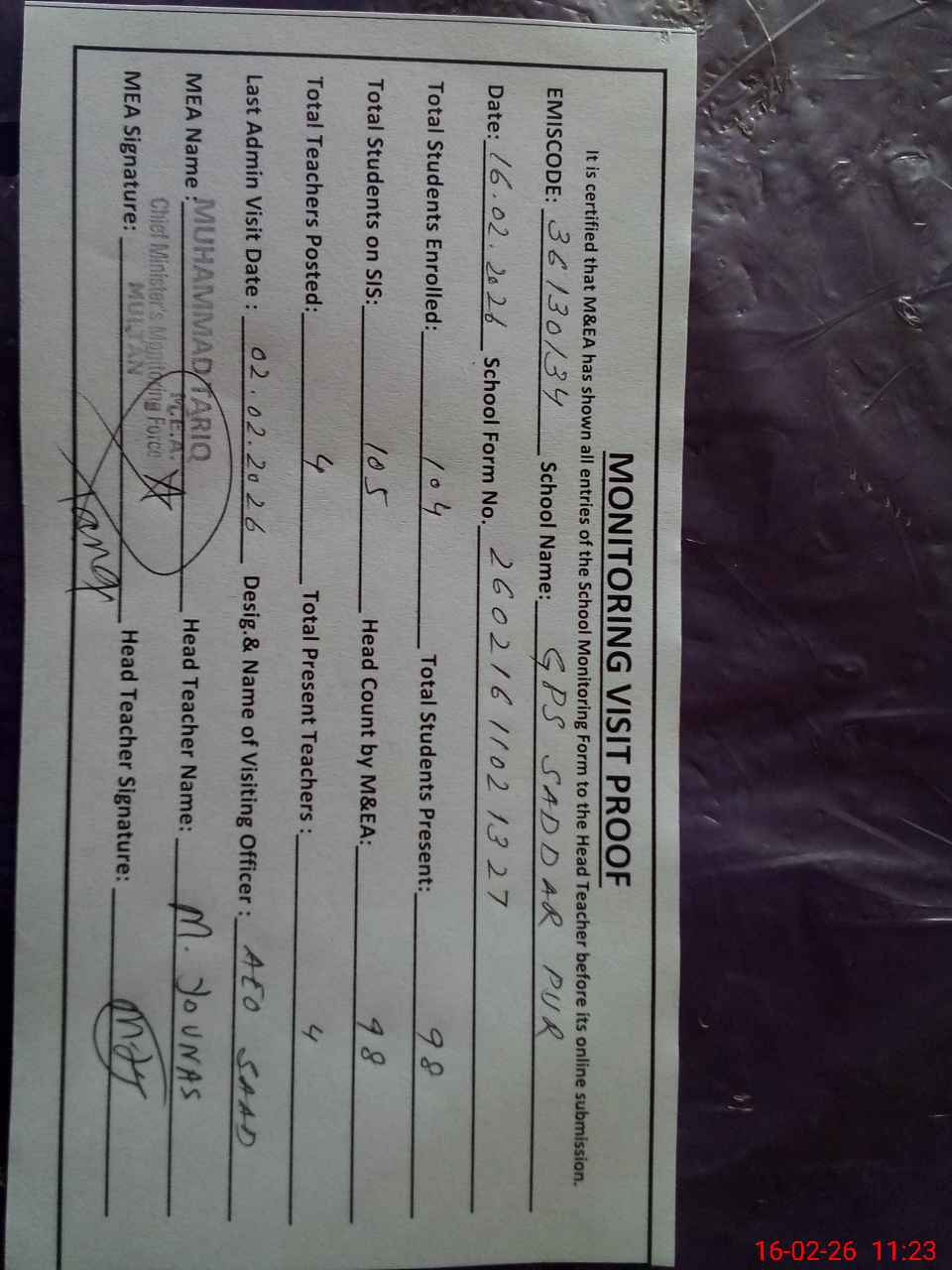 | EMIS Code: 36130134 | Name of School: GPS SADDAR PUR MULTAN MOUZA SADDAR PUR MULTAN | |||