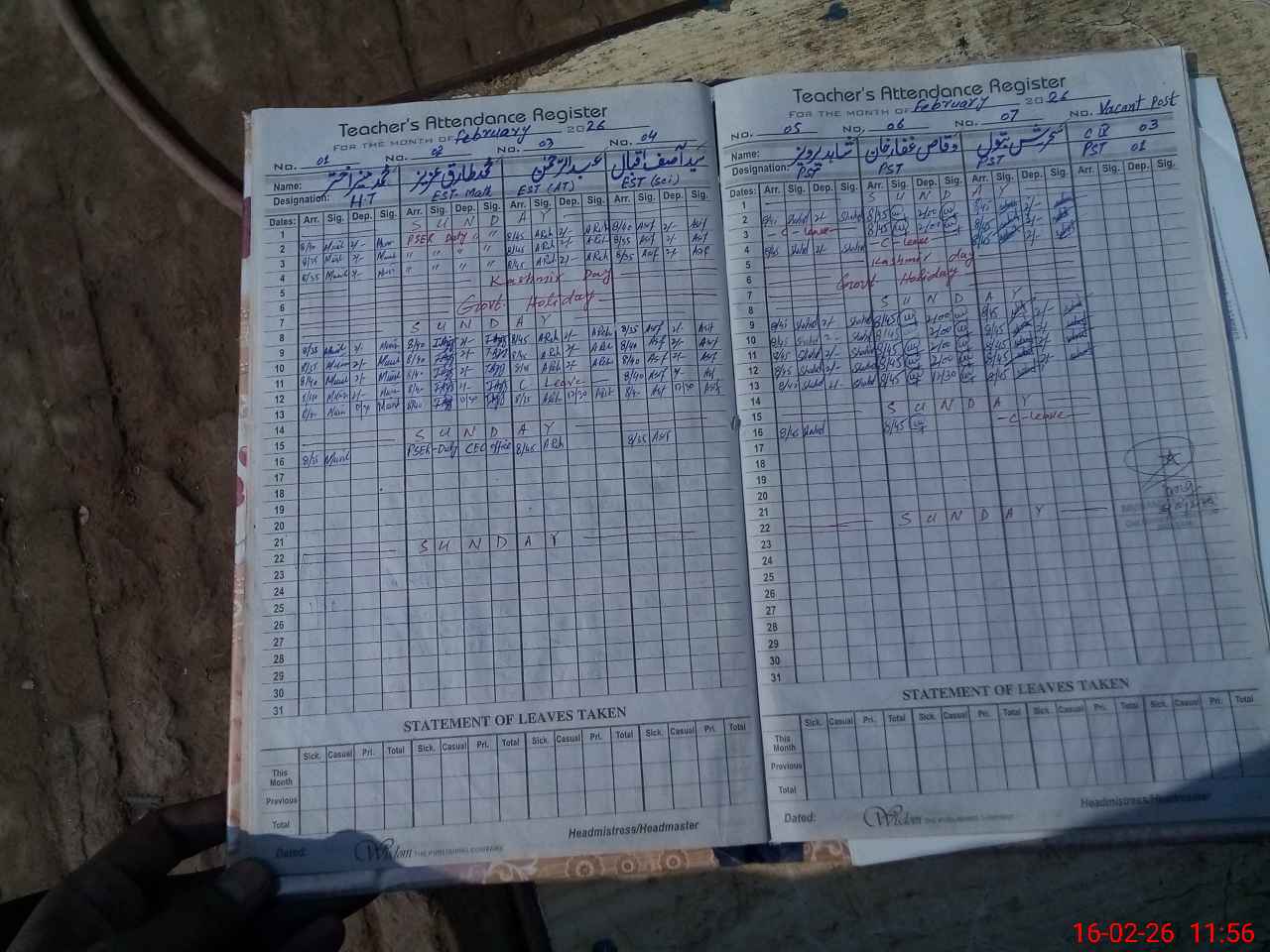 | Remarks (Use Separate Page if Required): WAPDA ELECTRICITY NOT AVAILABLE SOLAR PLATES ARE BEIN USED PST SEHRISH MARKED AS ON CASUAL LEAVE BUT HER SANCTIONED LEAVE RECORD NOT SHOWN EST TARIQ AZIZ MARKED ON PSER DUTY BUT HIS ORDERS NOT AVAILABLE | |||||