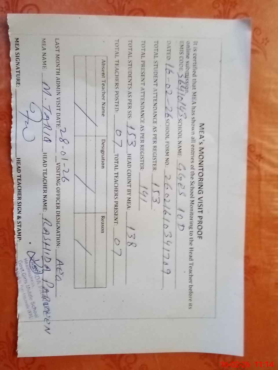 | Attendance Register | Head Teacher | MEA with School | Visit Proof |