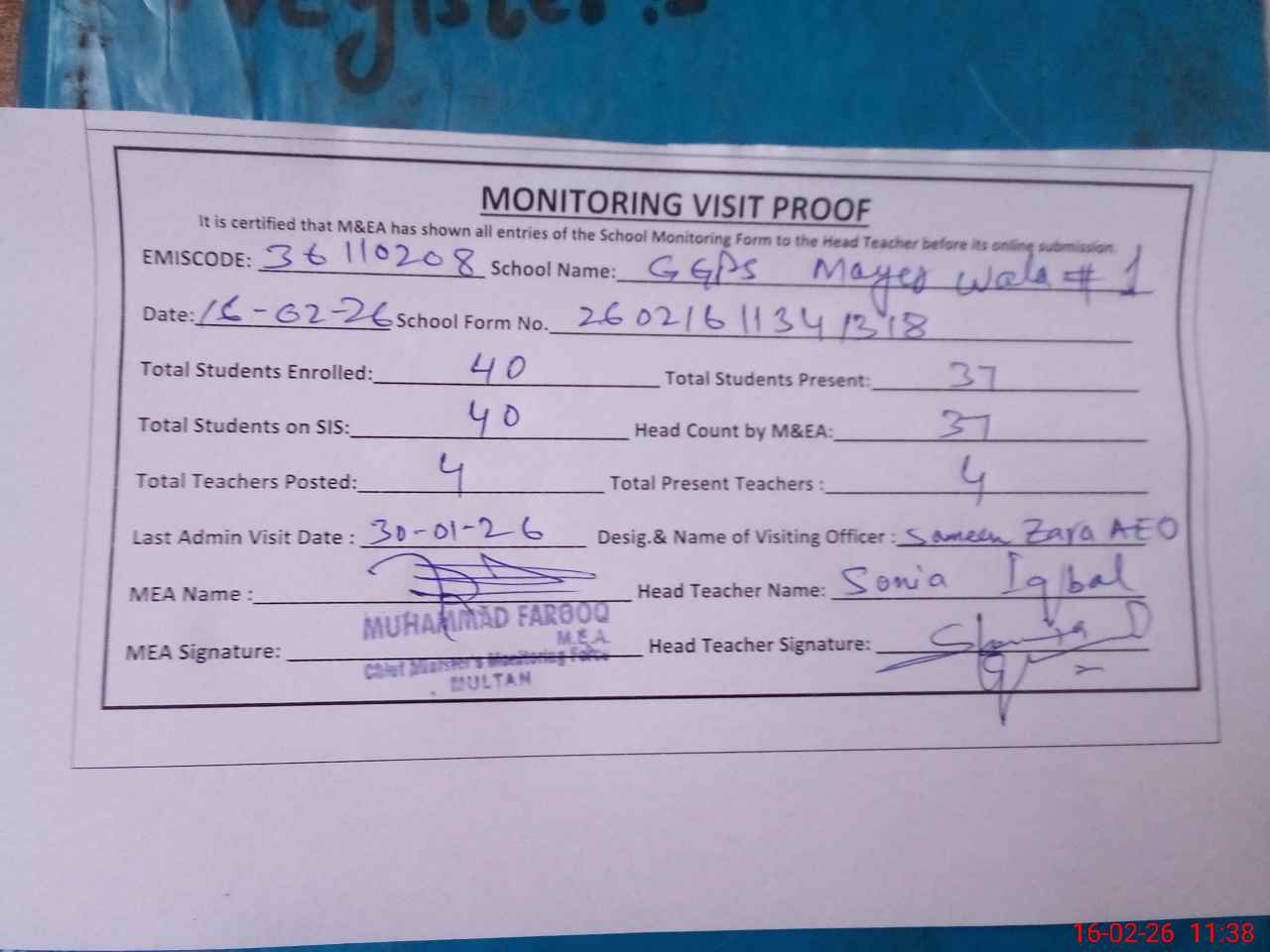 | Attendance Register | Head Teacher | MEA with School | Visit Proof |