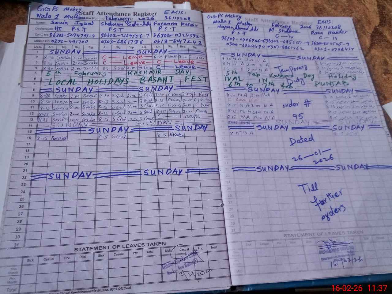 | CNIC | Full Name | Designation | R/C | Absence During Last Calender Month |