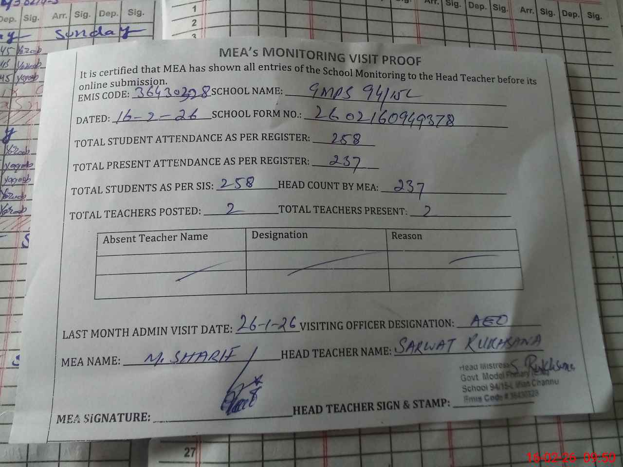 | Attendance Register | Head Teacher | MEA with School | Visit Proof |