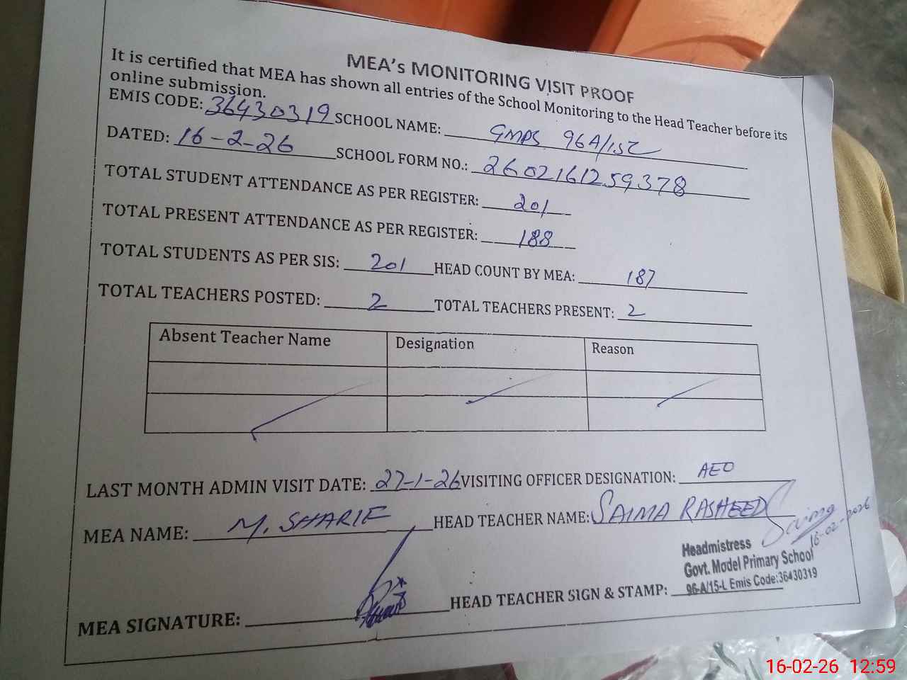 | EMIS Code: 36430319 | Name of School: GMPS 96-A/15-L, MIAN CHANNU | |||