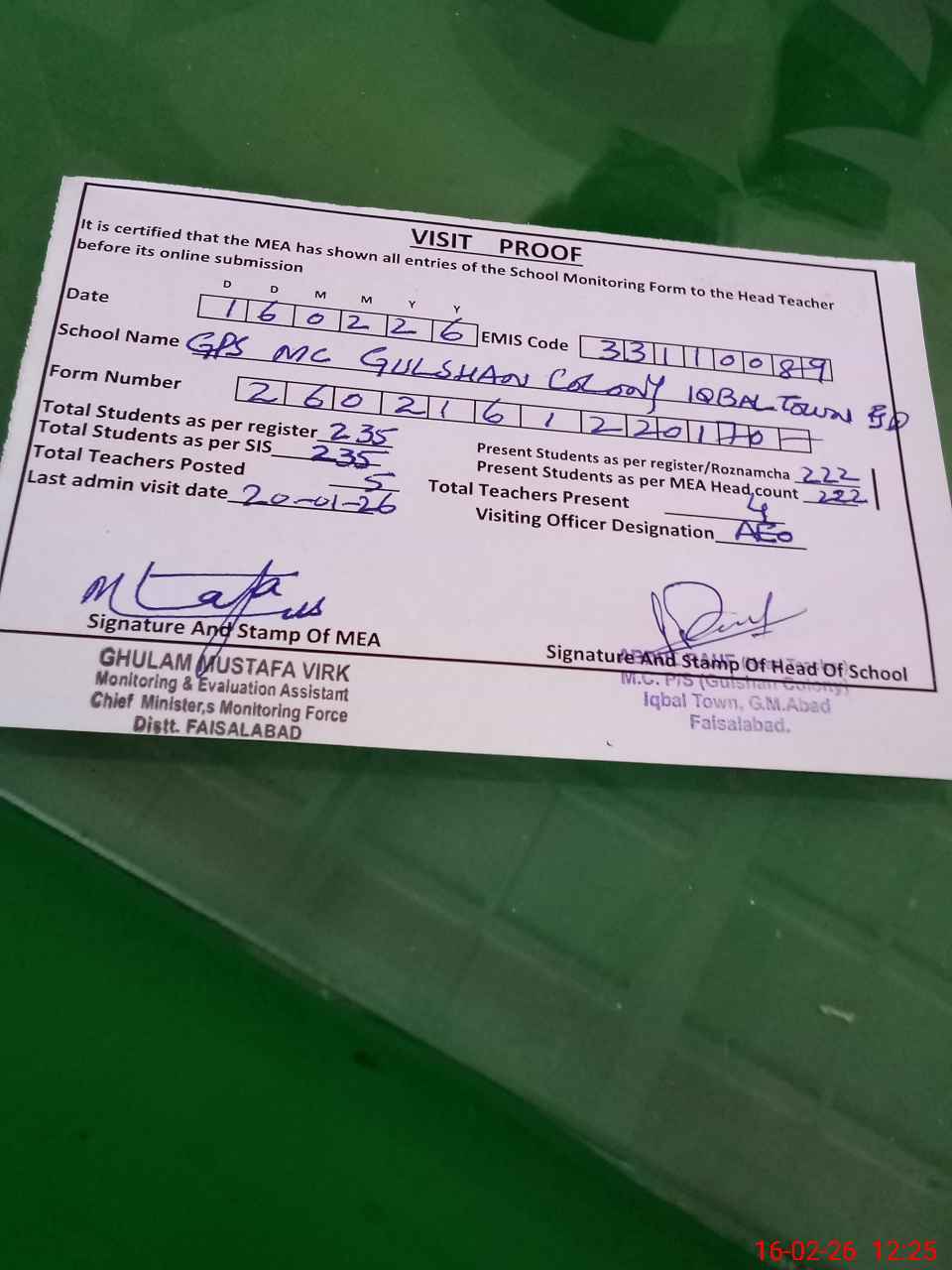 | EMIS Code: 33110089 | Name of School: GPS MC GULSHAN COLONY IQBAL TOWN FSD | |||