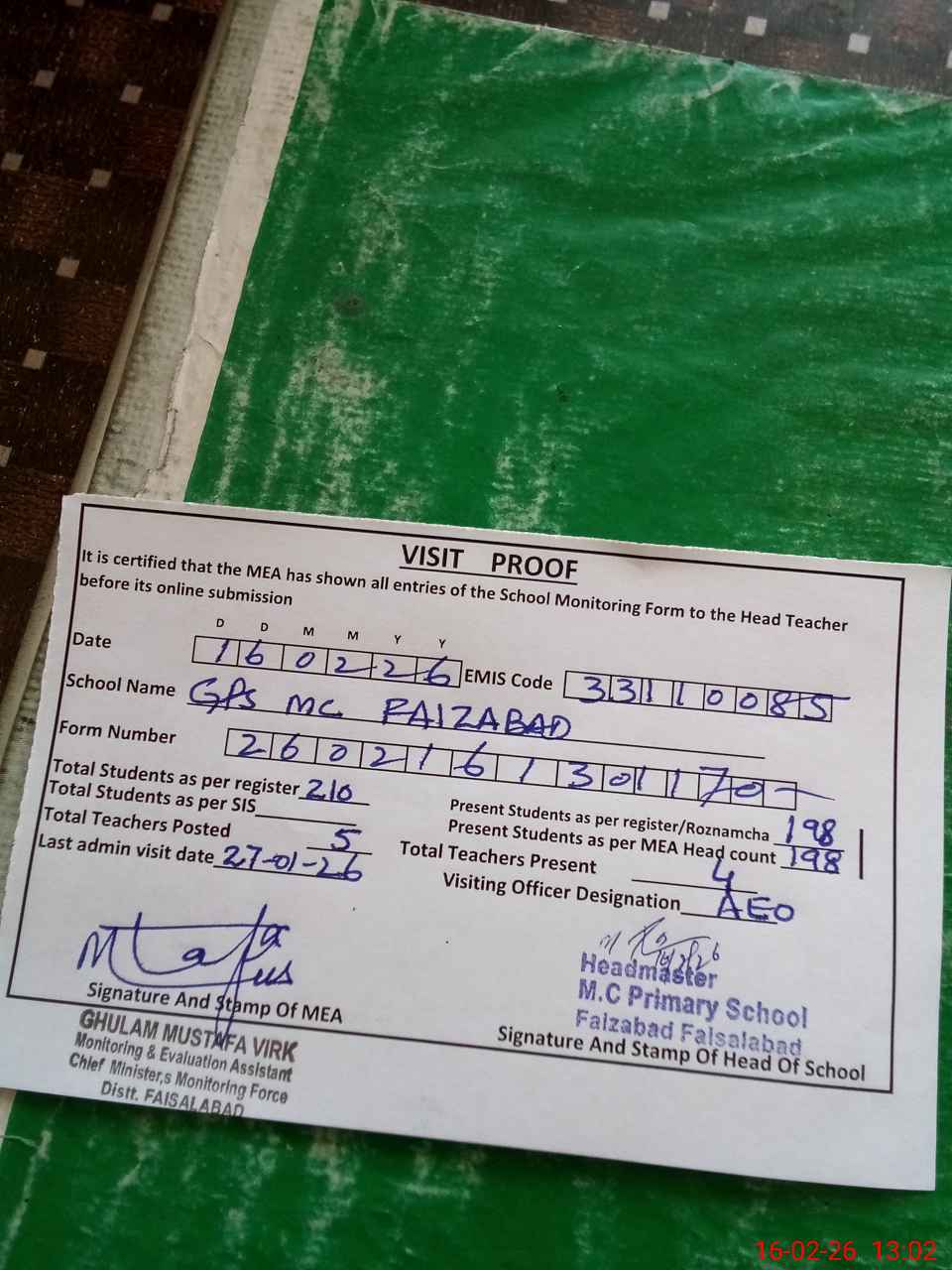 | EMIS Code: 33110085 | Name of School: GPS MC FAIZABAD FSD | |||
