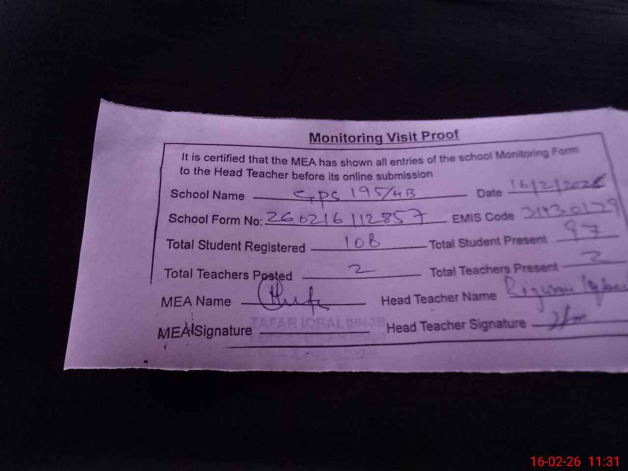 | Attendance Register | Head Teacher | MEA with School | Visit Proof |
