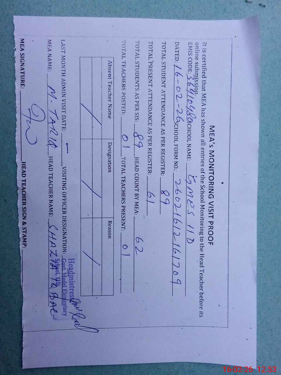 | EMIS Code: 36410480 | Name of School: GMES 11/D, ABDUL HAKIM | |||