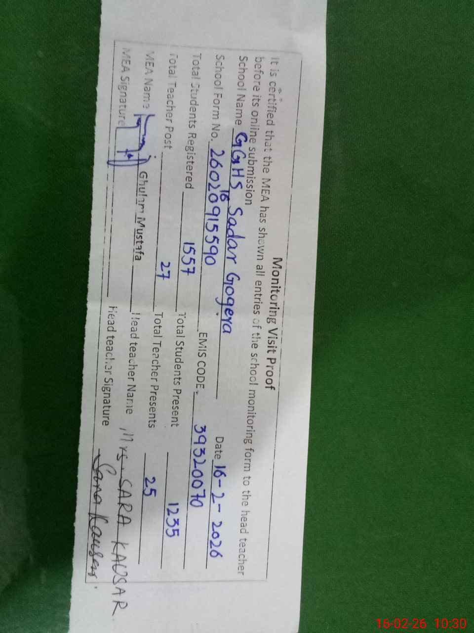 | EMIS Code: 39320070 | Name of School: GGHS SADAR GOGERA | |||