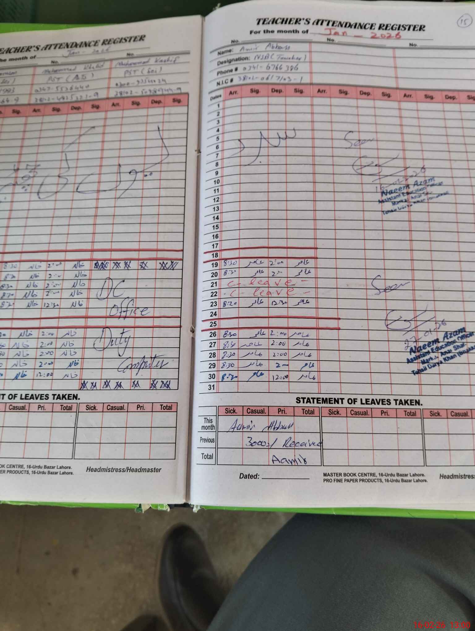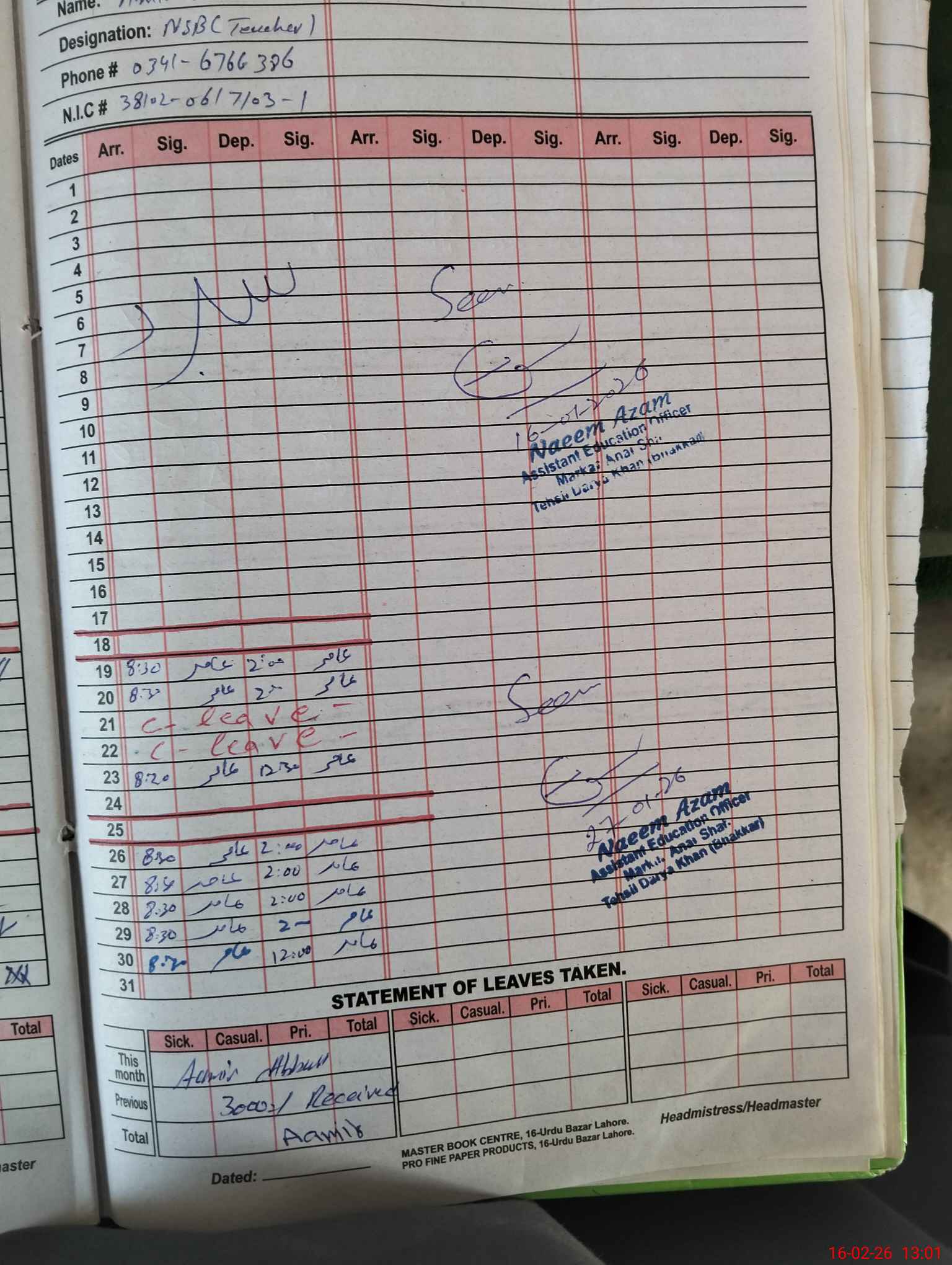 | CNIC | Full Name | Designation | R/C | Absence During Last Calender Month |