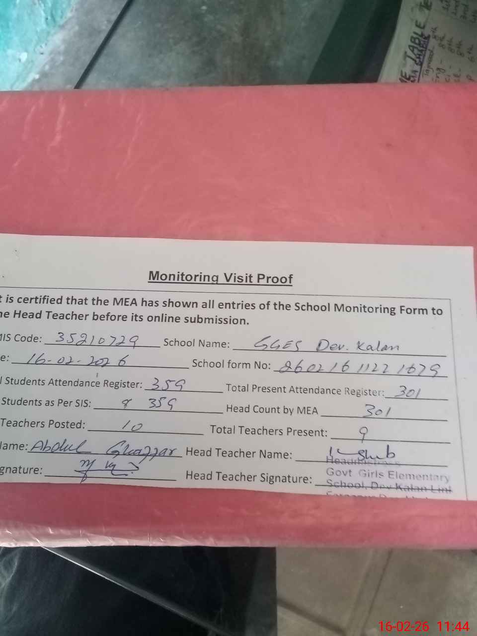 | Attendance Register | Head Teacher | MEA with School | Visit Proof |