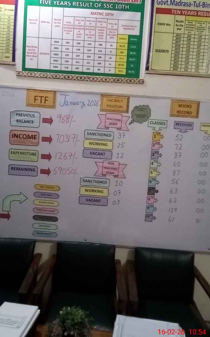 | EMIS Code: 35220070 | Name of School: GGHS MADRASA-TUL-BINAT MISRI SHAH AZIZ ROAD | |||