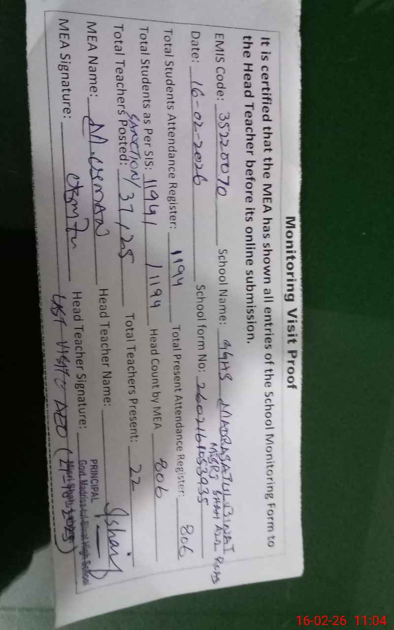 | Attendance Register | Head Teacher | MEA with School | Visit Proof |