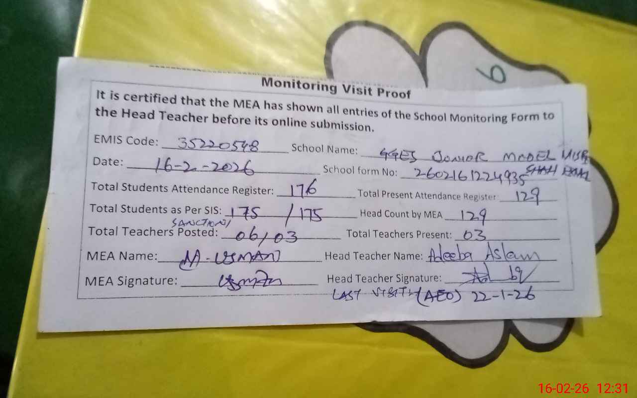 | EMIS Code: 35220548 | Name of School: GGES JUNIOR MODEL MISRI SHAH (EX-MCL) | |||