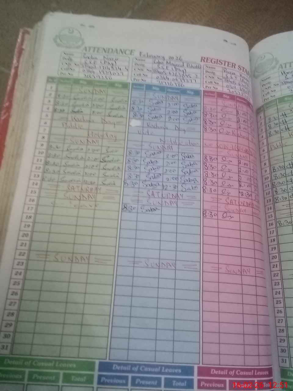 | CNIC | Full Name | Designation | R/C | Absence During Last Calender Month |