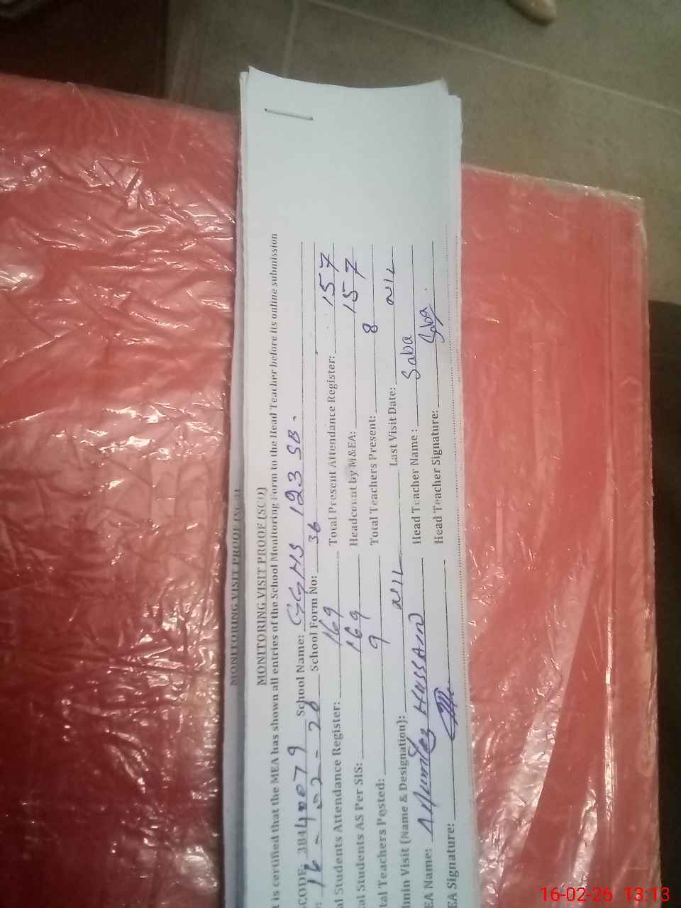 | Attendance Register | Head Teacher | MEA with School | Visit Proof |