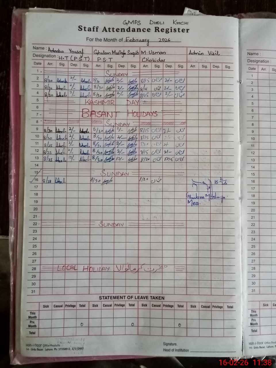 | Leave | Duty | Absent | Maternity | Medical | Ex- Pak |
