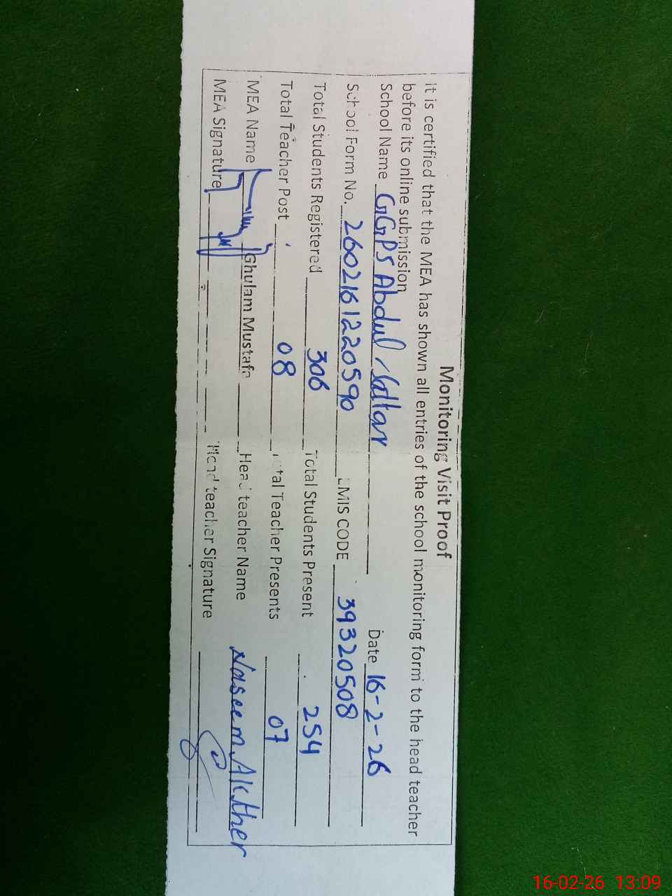 | Certified that this School was Inspected by the Undersigned MEA/DMO Today and the Information Stated Above is as Per Record. | |||||