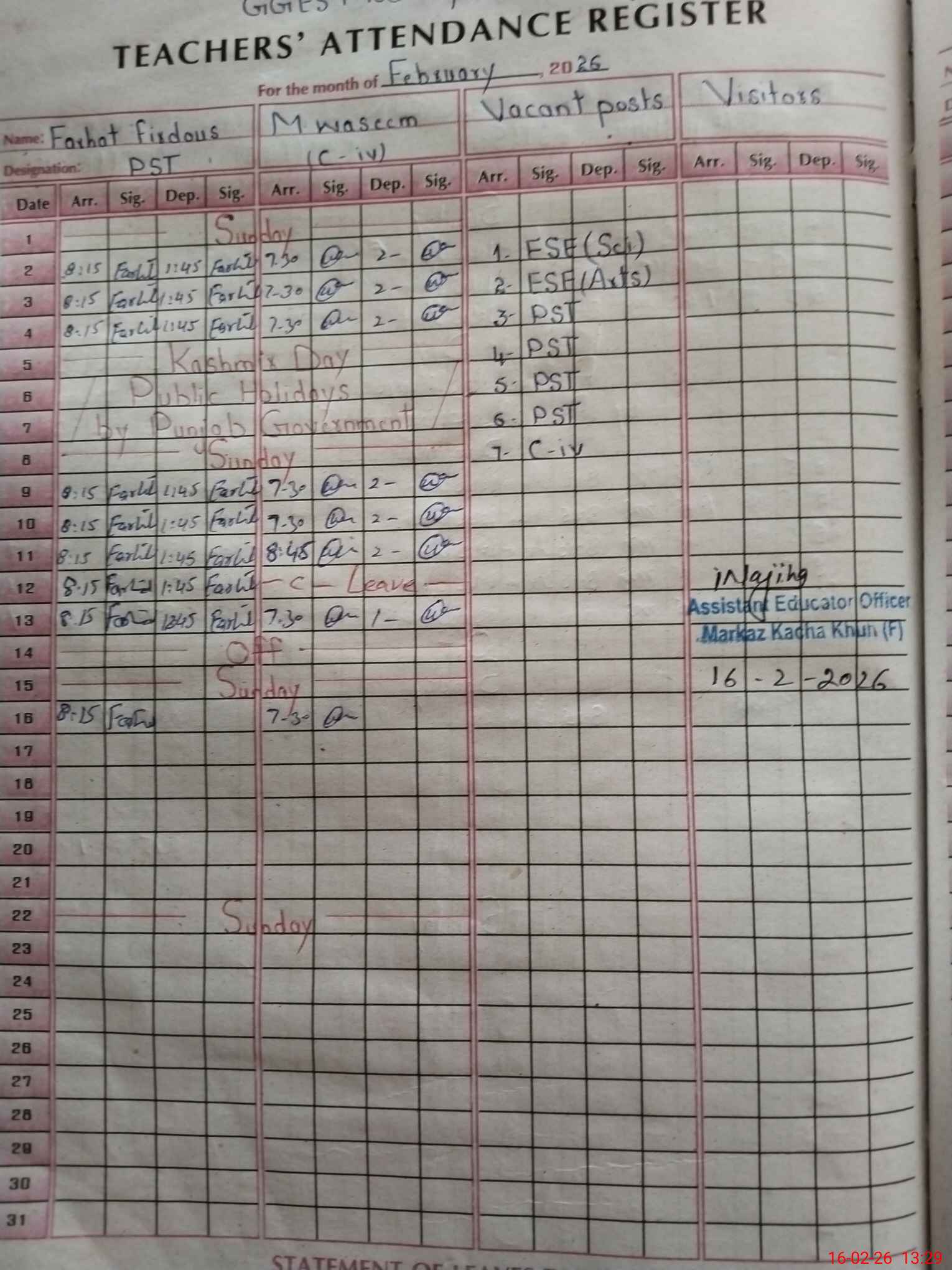 | CNIC | Full Name | Designation | R/C | Absence During Last Calender Month |