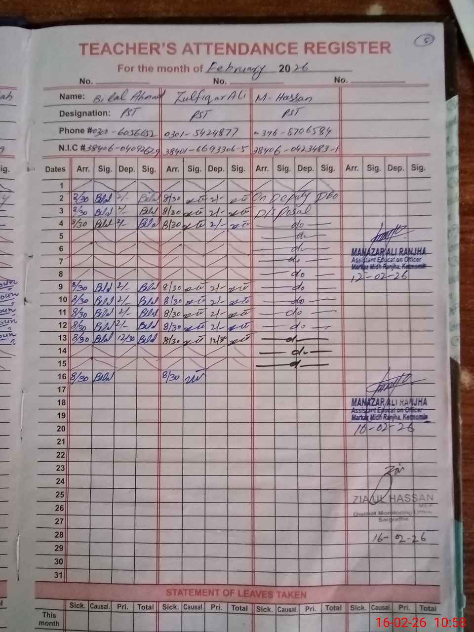 | CNIC | Full Name | Designation | R/C | Absence during last cal. month |