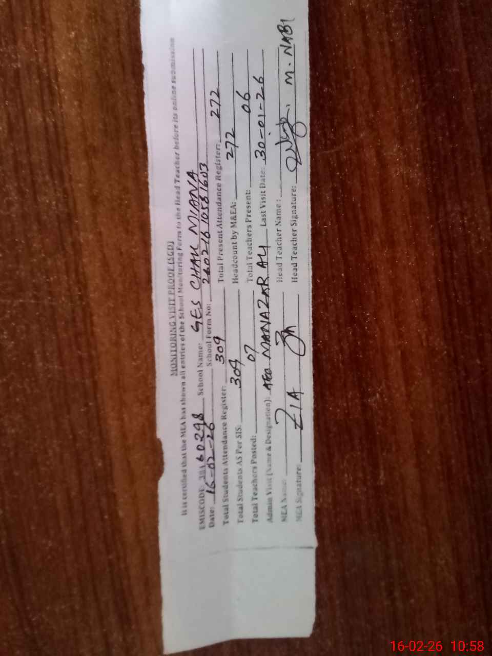| Attendance Register | Head Teacher | MEA with School | Visit Proof |