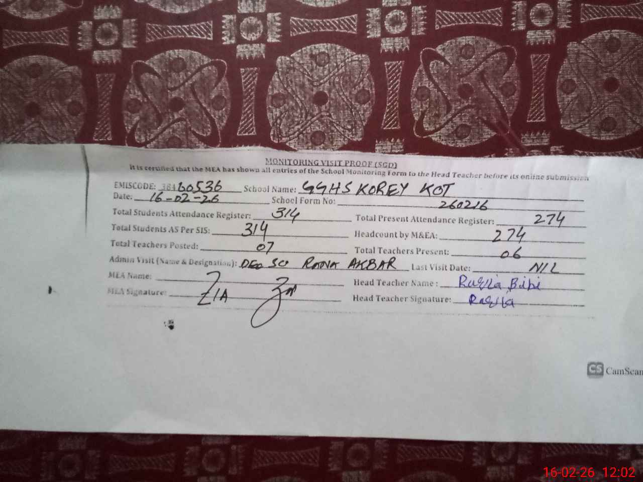| EMIS Code: 38460536 | Name of School: GGHS KOREY KOT | |||