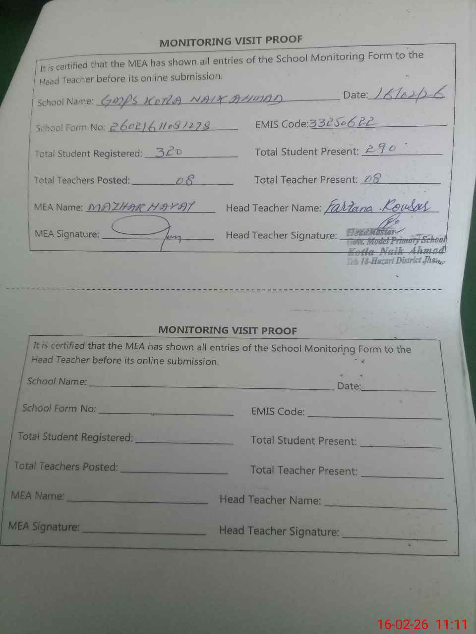 | Attendance Register | Head Teacher | MEA with School | Visit Proof |