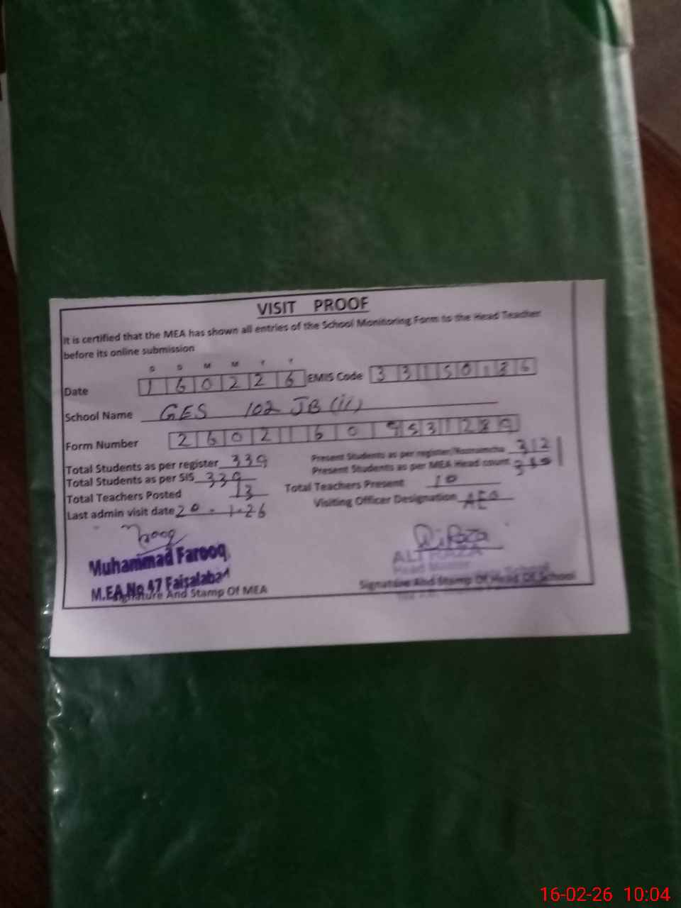 | EMIS Code: 33150186 | Name of School: GES CHAK 102 JB FSD | |||