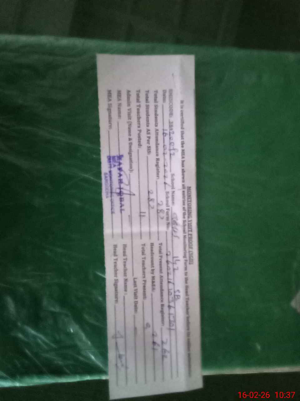 | Attendance Register | Head Teacher | MEA with School | Visit Proof |