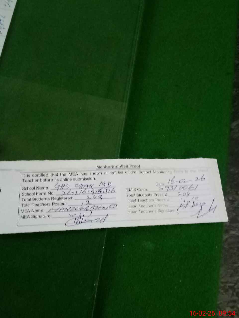 | Certified that this School was Inspected by the Undersigned MEA/DMO Today and the Information Stated Above is as Per Record. | |||||