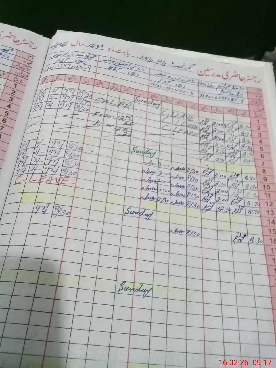 | CNIC | Full Name | Designation | R/C | Absence During Last Calender Month |