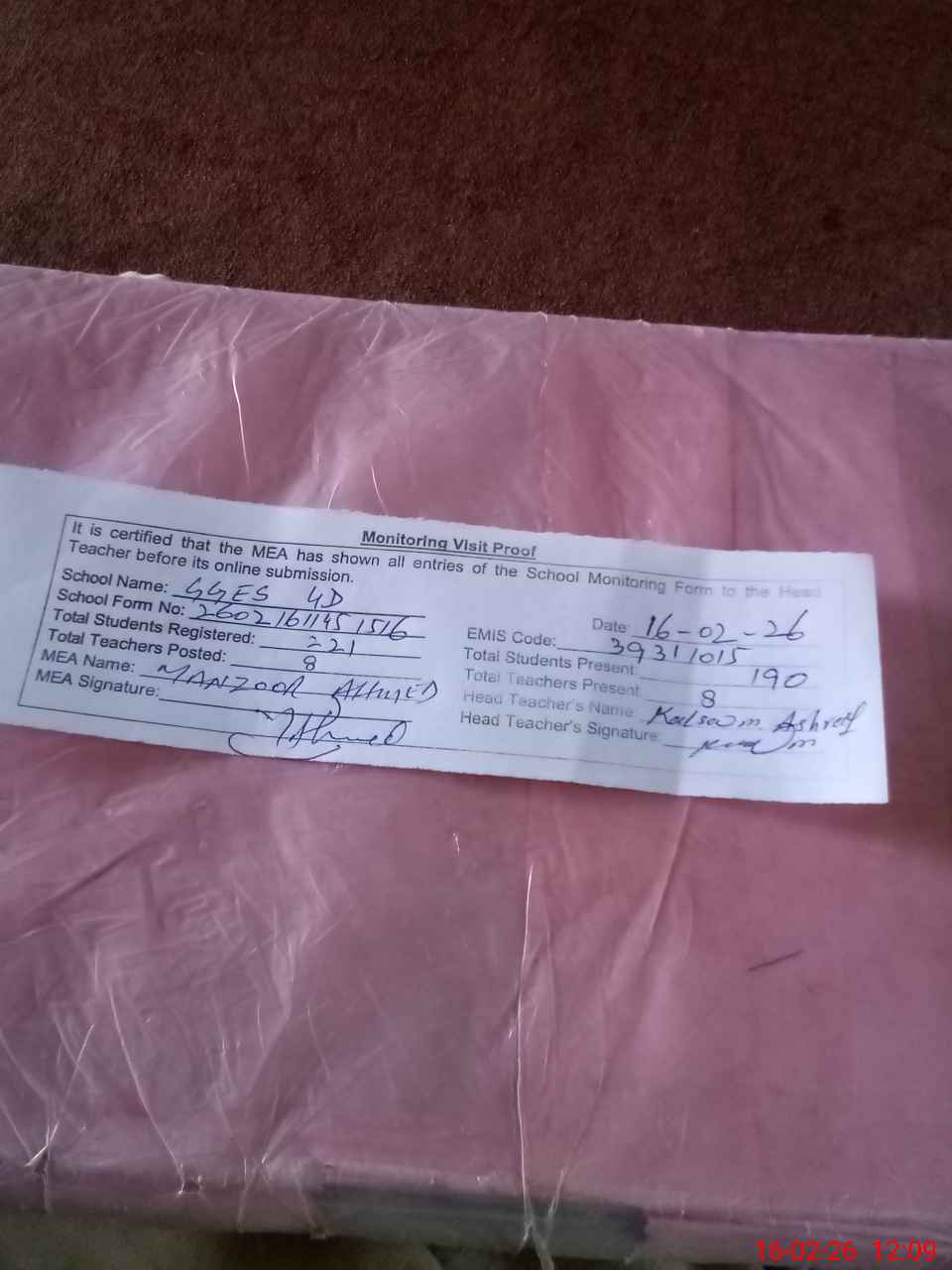 | Attendance Register | Head Teacher | MEA with School | Visit Proof |