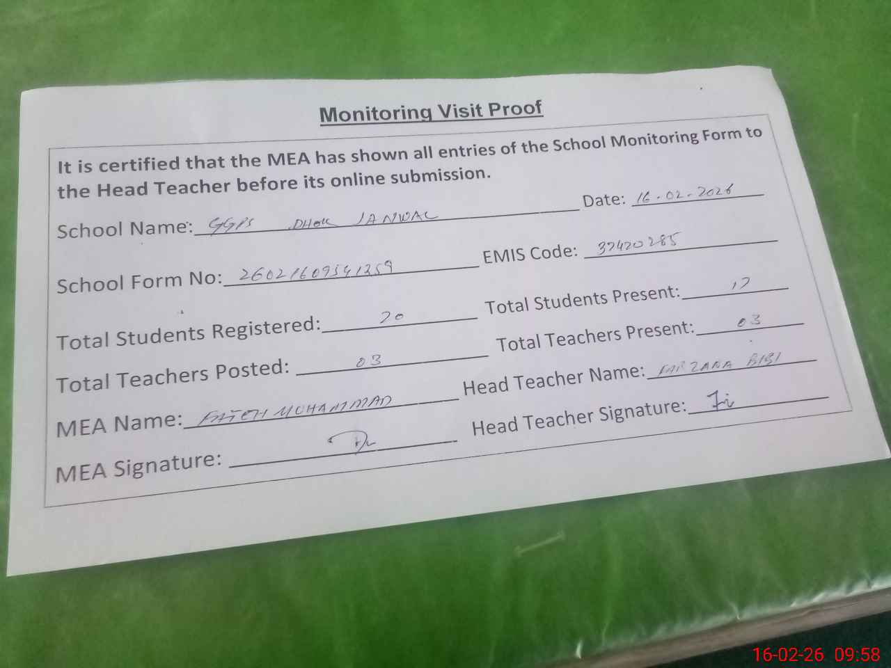 | Attendance Register | Head Teacher | MEA with School | Visit Proof |