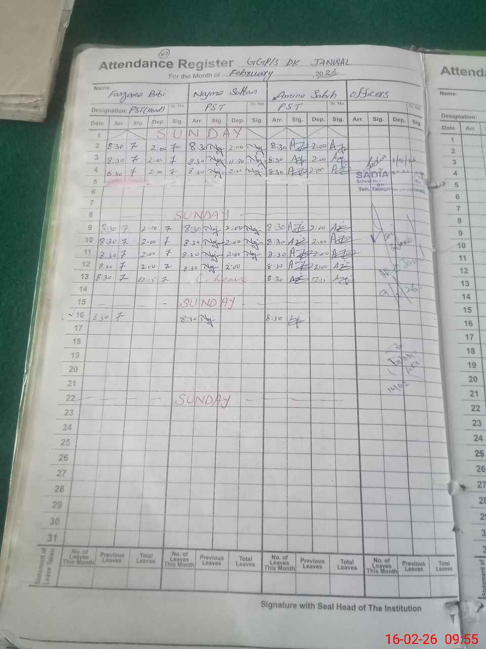 | CNIC | Full Name | Designation | R/C | Absence During Last Calender Month |