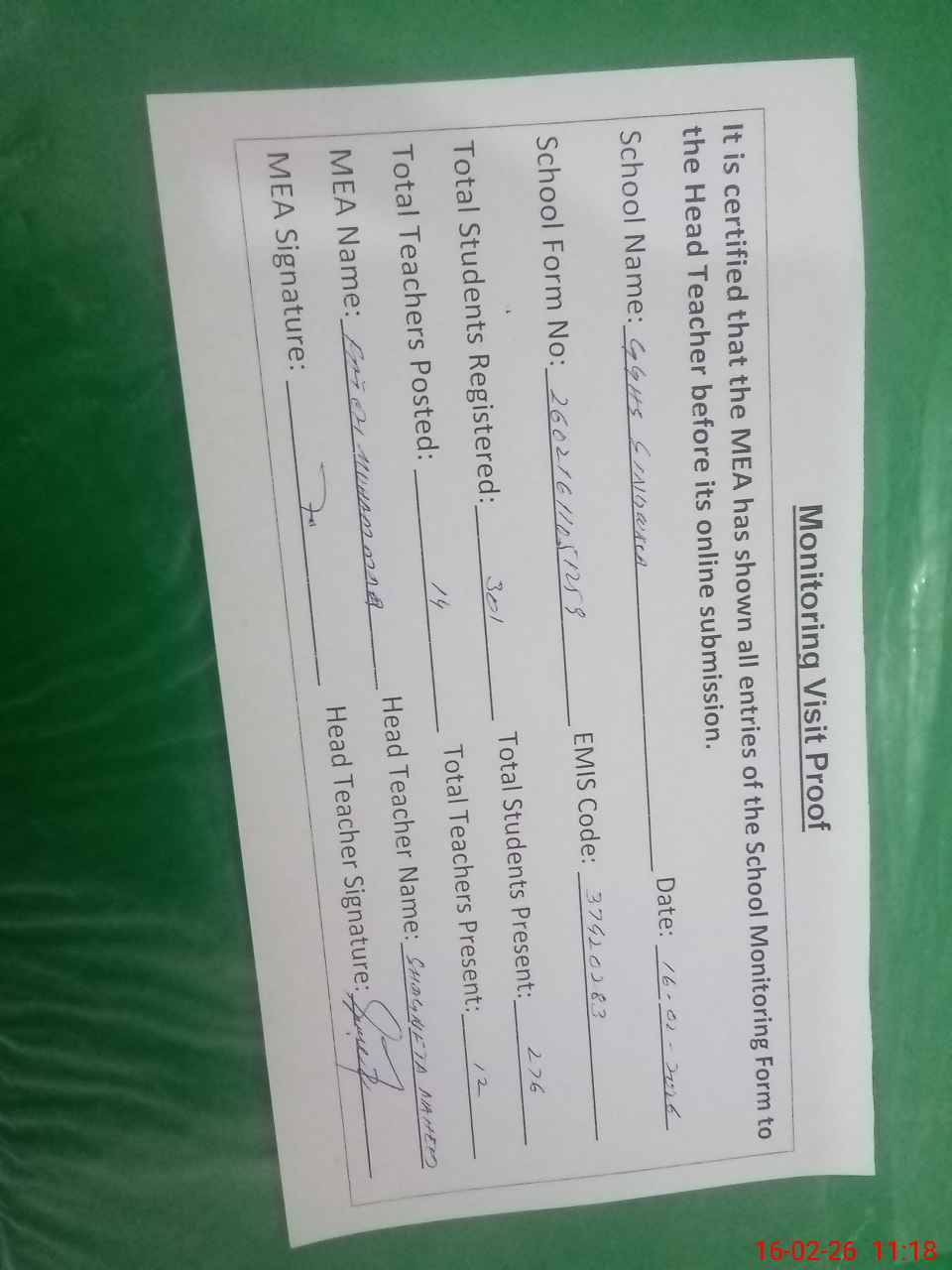| Attendance Register | Head Teacher | MEA with School | Visit Proof |