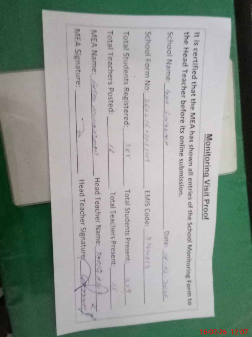 | Attendance Register | Head Teacher | MEA with School | Visit Proof |