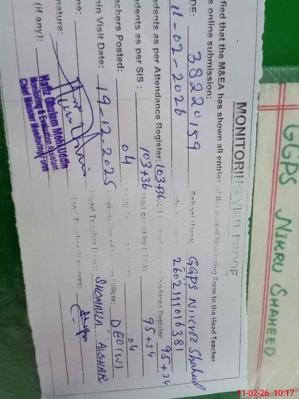 | Remarks (Use Separate Page if Required): last visit by DEO 19 December 2025 | |||||