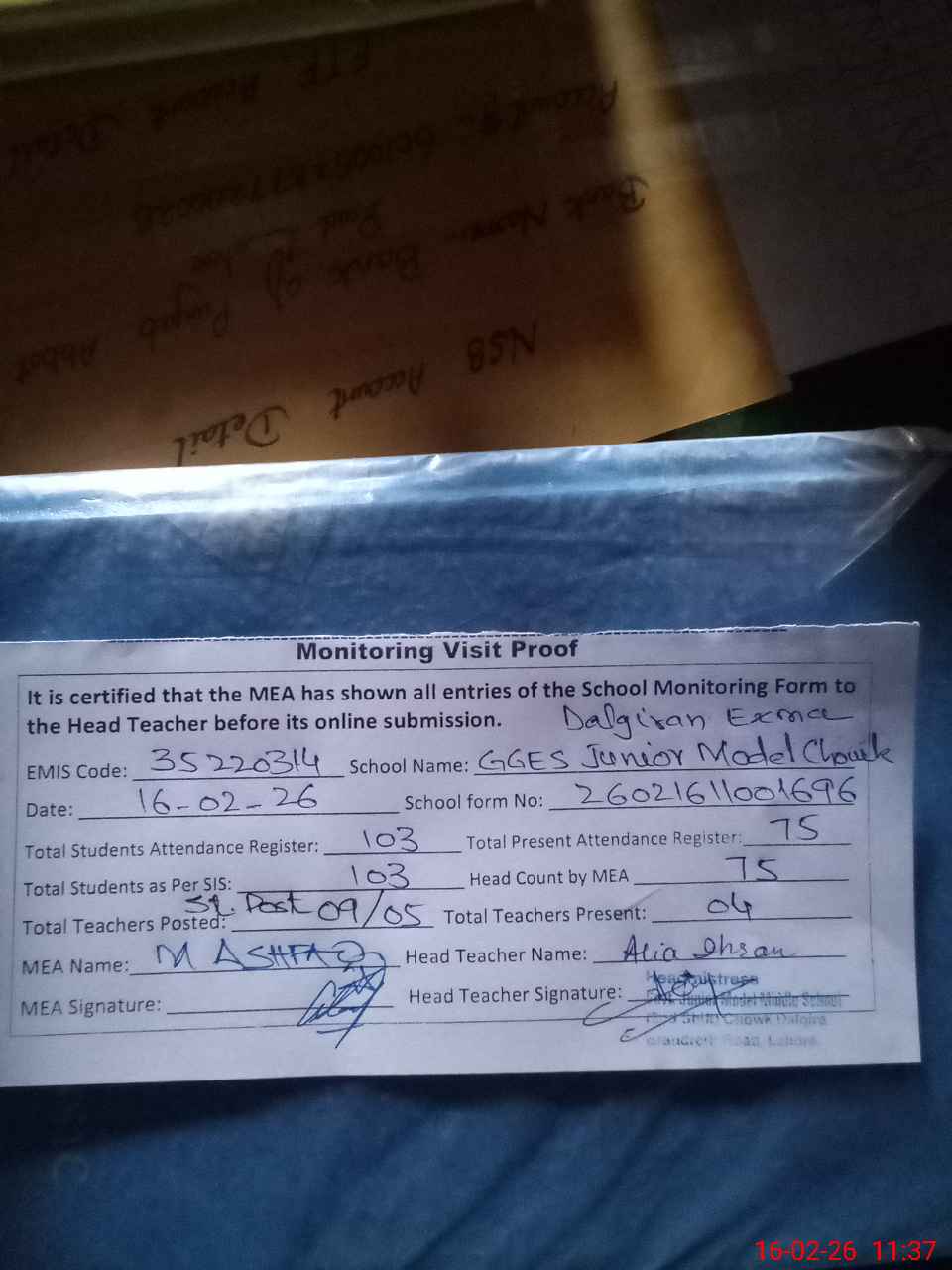 | Attendance Register | Head Teacher | MEA with School | Visit Proof |
