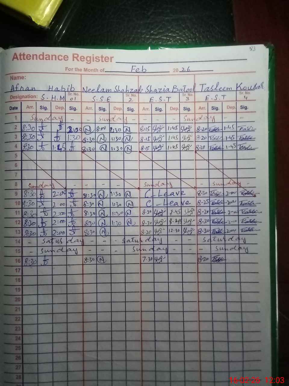 | CNIC | Full Name | Designation | R/C | Absence During Last Calender Month |