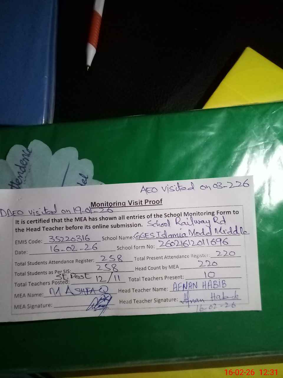 | Attendance Register | Head Teacher | MEA with School | Visit Proof |