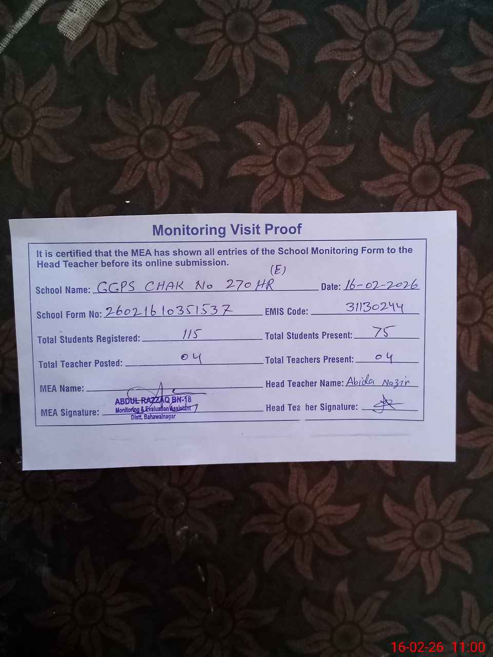 | Monitoring Date: 16-02-2026 | Start Time: 16-02-2026 10:35 AM | End Time: 16-02-2026 11:06 AM | Name of MEA: Ab**** Ra**** BN**** | |