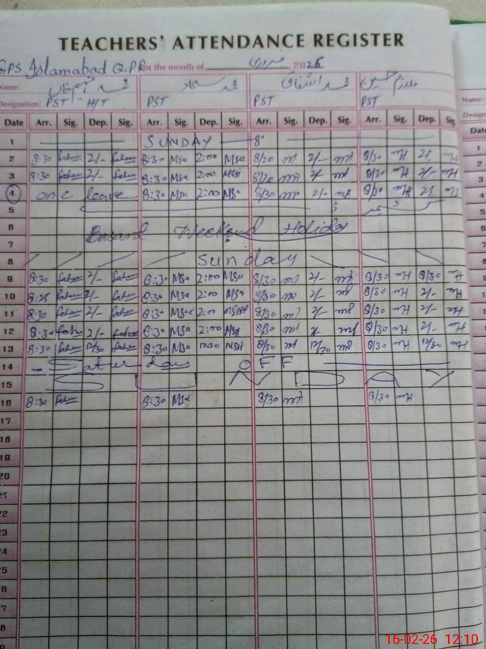 | Name: MFa**** Kh**** Designation: (School Headmaster's/Headmistress's) PST Phone/Cell Number: 03**** |