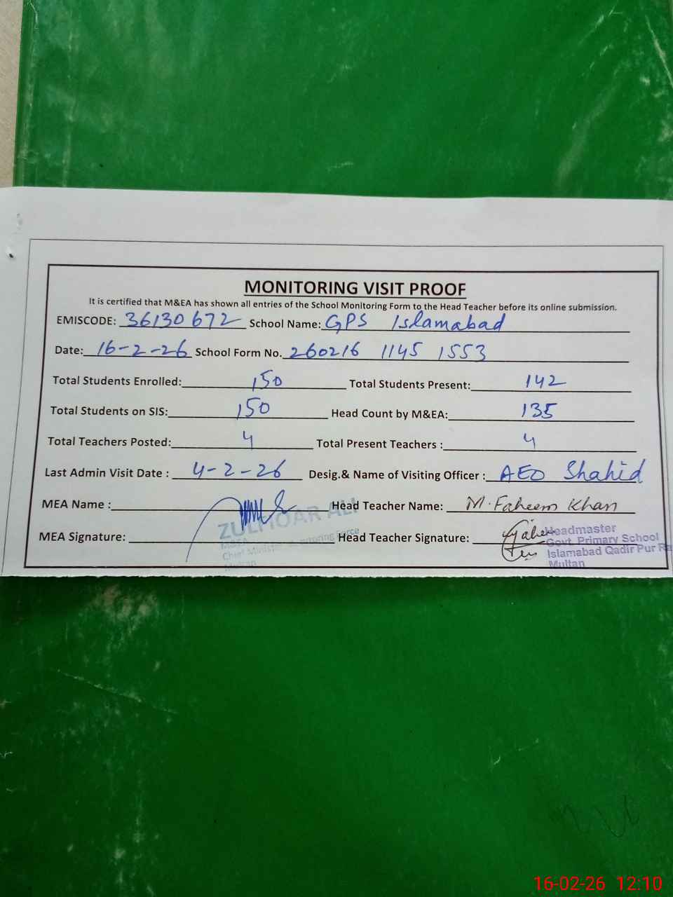 | Attendance Register | Head Teacher | MEA with School | Visit Proof |