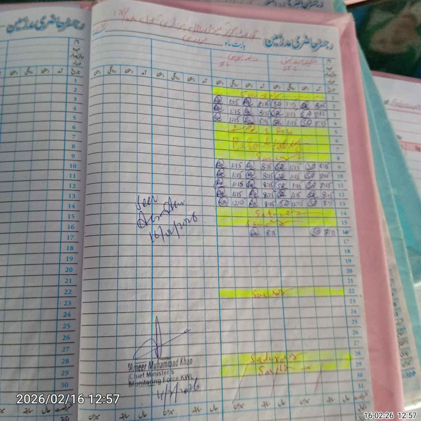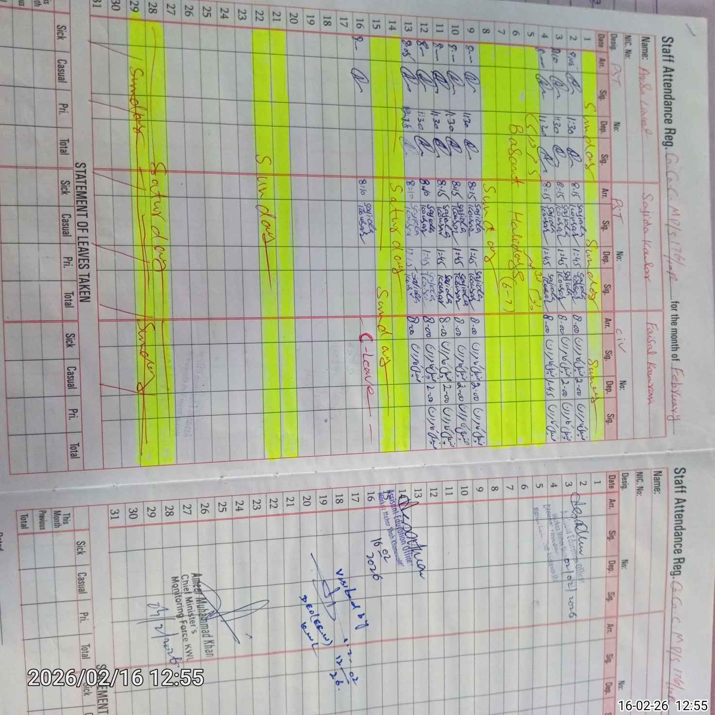 | CNIC | Full Name | Designation | R/C | Absence During Last Calender Month |