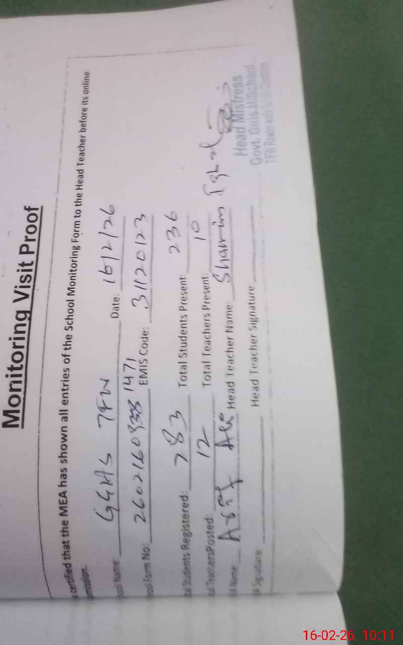 | EMIS Code: 31120123 | Name of School: GGHS CHAK 7/FW RANWAN WALA | |||