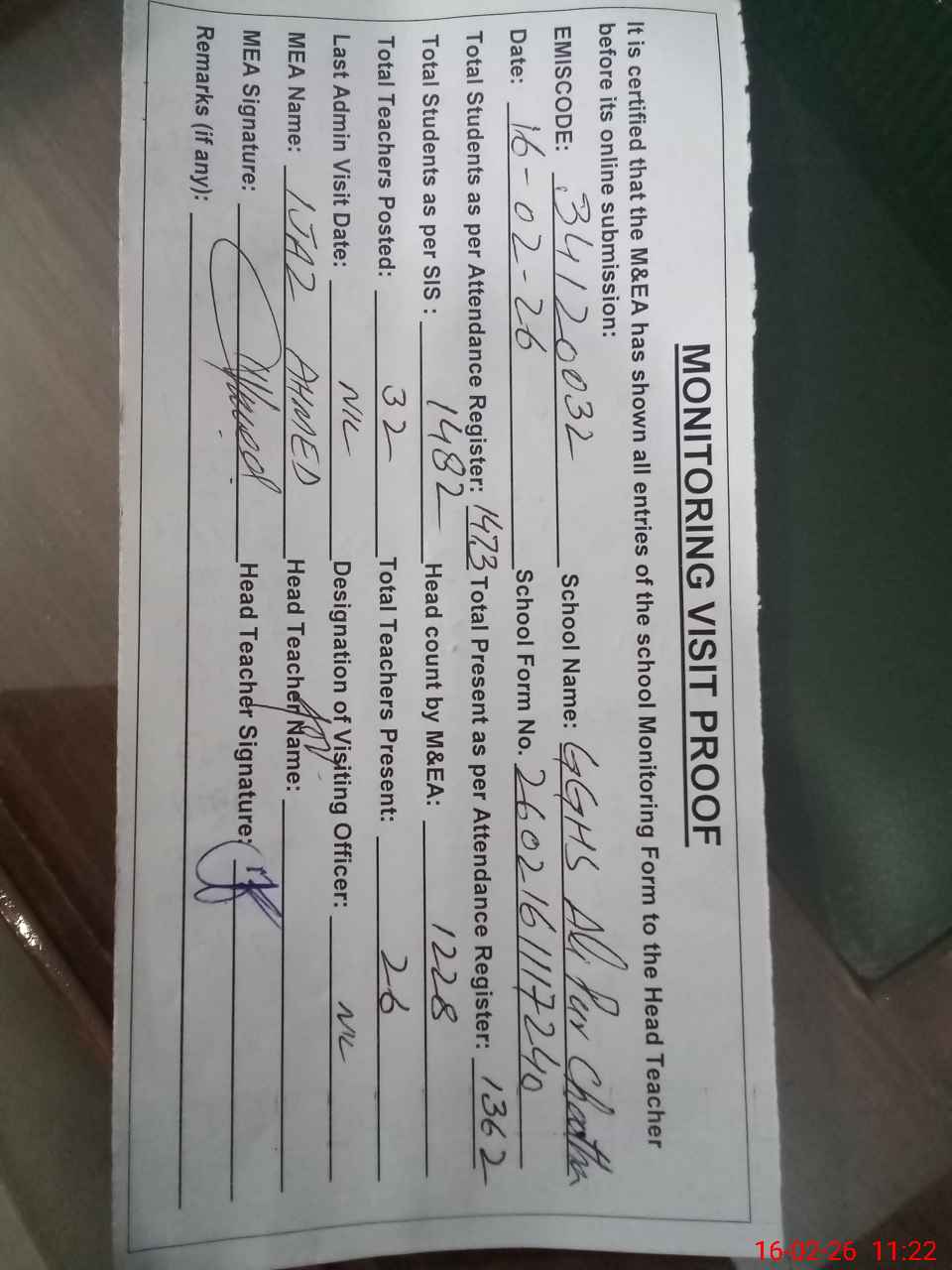 | Attendance Register | Head Teacher | MEA with School | Visit Proof |